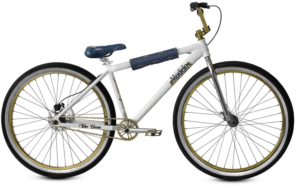 Inspired by the bold character of Modelo, this limited-edition 29" Goon delivers a clean white frame dressed in regal gold and navy details. Custom-branded accents, rich patterned pads and saddle, and a polished chrome fork make this bike shine from every angle — whether it’s posted on the curb or rolling deep through the city.